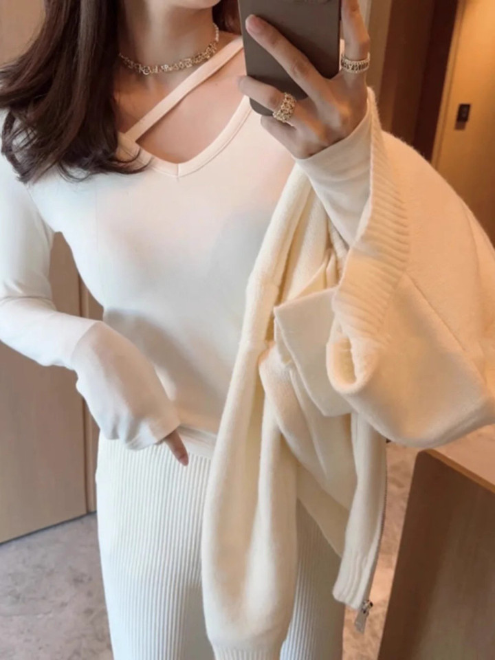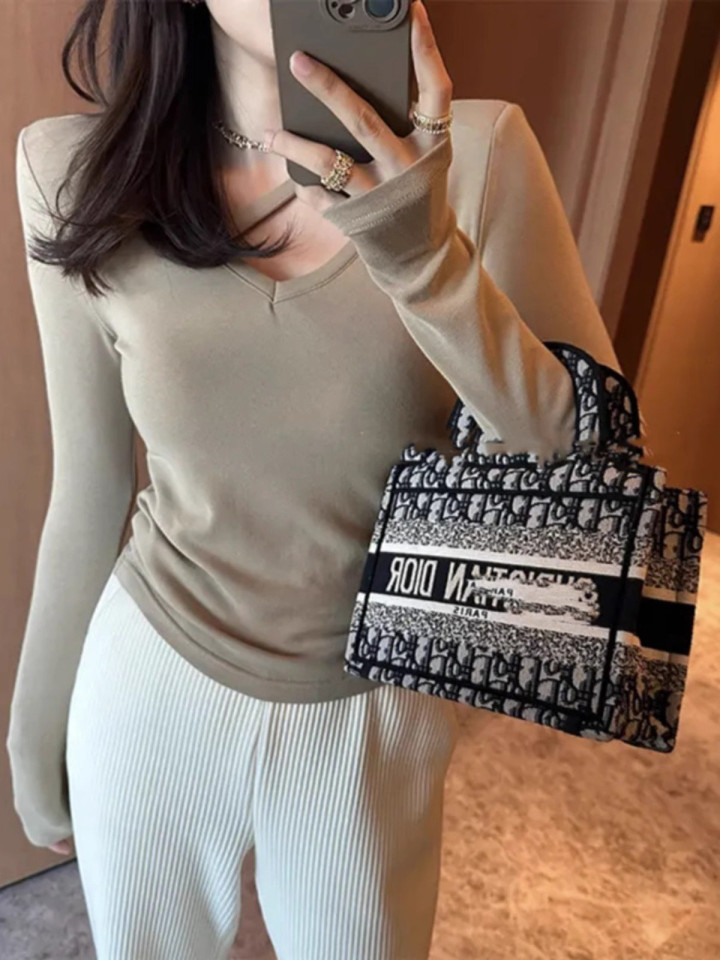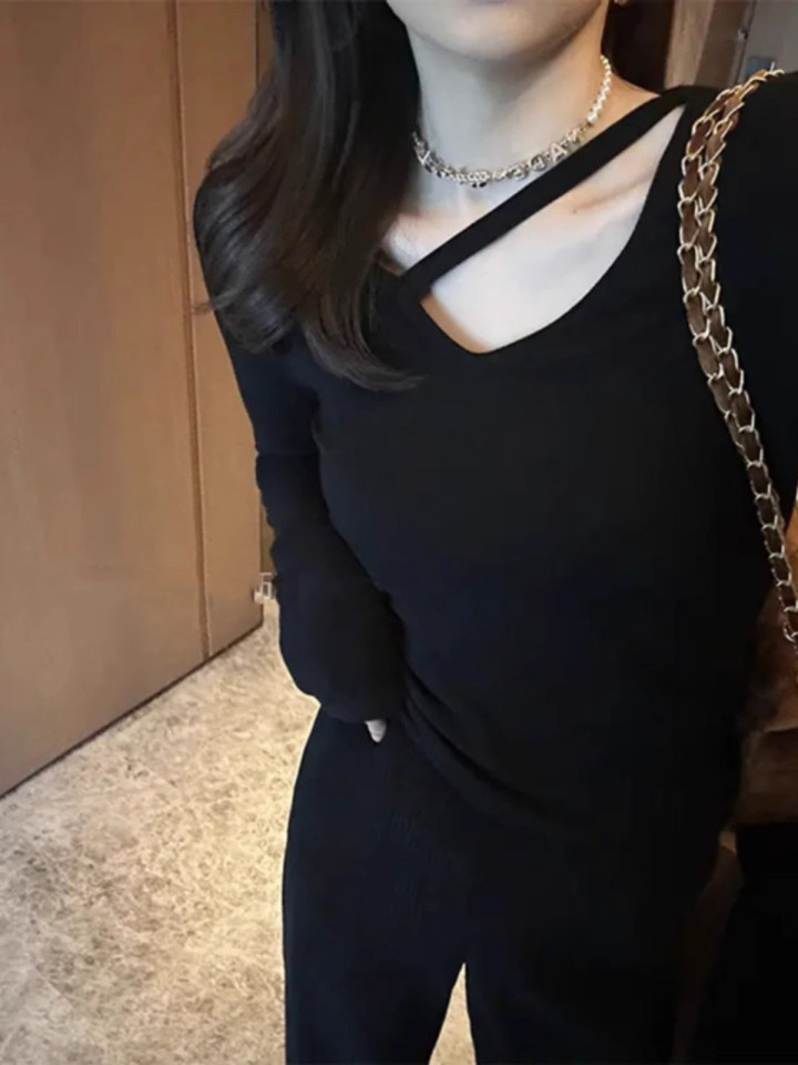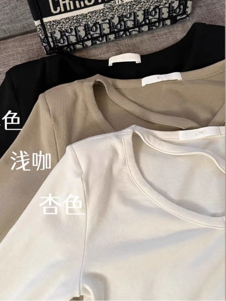 > 黑色V领打底衫女春季内搭正肩长袖T恤设计
